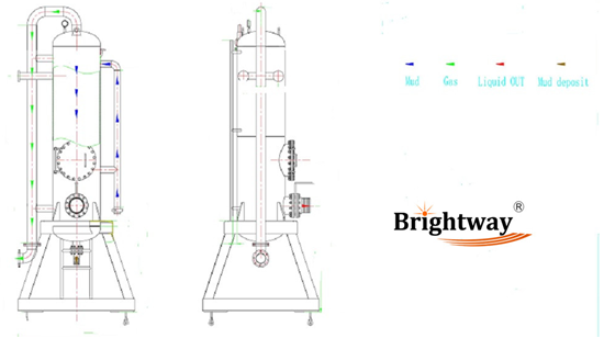 安裝就位后,將2號(hào)排氣管線引至距離井口60-80m處(管線自己配。如需廠家供給,訂貨時(shí)說(shuō)明)。其3號(hào)進(jìn)漿口與旋轉(zhuǎn)防噴器或節(jié)流管匯連接,關(guān)閉4號(hào)排污口蝶閥,打開7號(hào)出漿口蝶閥,用管線接到1號(hào)泥漿罐內(nèi)即可。